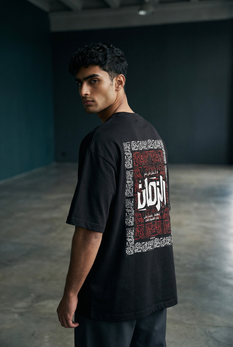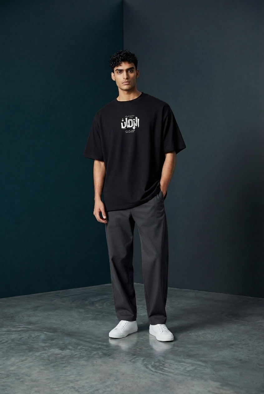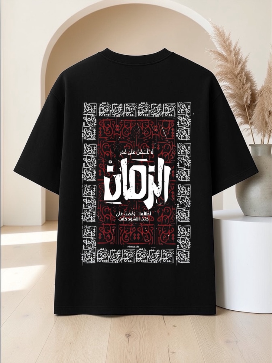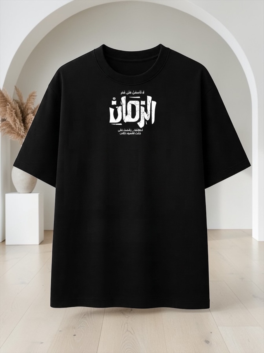 تيشيرت أسود أوفر سايز بتصميم عربي مميز يجمع بين البساطة والقوة في نفس الوقت. يأتي هذا التيشيرت بطباعة أنيقة لعبارة "لا تأسفن على غدر الزمان لطالما رقصت على جثث الأسود كلاب" في منتصف الصدر وفي الظهر، لتمنح الإطلالة طابعاً جريئاً يعكس الثقة والشخصية القوية. اللون الأسود الكلاسيكي يجعل التيشيرت قطعة أساسية سهلة التنسيق مع الجينز أو الشورت أو أي إطلالة كاجوال عصرية.